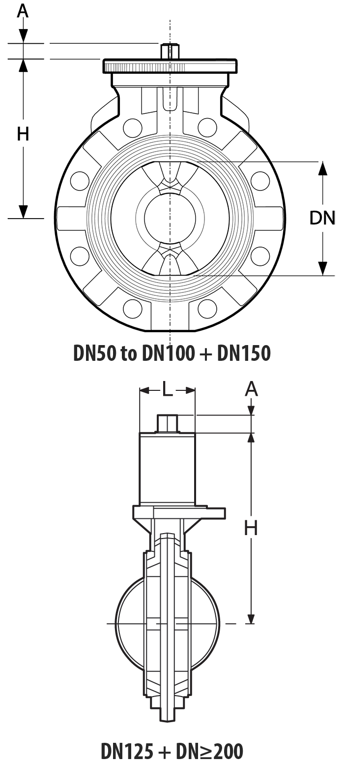 (*) To order a butterfly valve ready for actuation, please add the code ACTUREADY after the code of the valve. For example 3600-09WWE + ACTUREADY : - for DN50 to DN100 + DN150: the handled is removed. - for DN125, DN200 and higher : the handled or the gearbox is removed, the face is machined and drilled To actuate a type 3610 butterfly valve, please contact us.